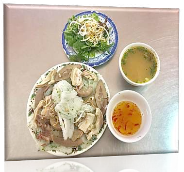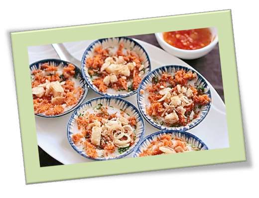 听名字这两种食物好像毫无关联,不过在归仁市,这两种食物是要一起吃才有趣。香甜的粥水配着猪杂和滨海(banh hoi)一起吃,很简单的吃法,滋味却出乎意料的棒。