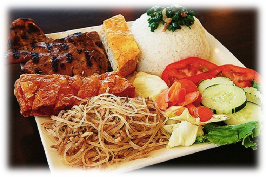 碎米饭不仅有碎米,还要加上红亮且微微有点焦的烤排骨、清绿色的葱、白色的萝卜丝和橙色的胡萝卜丝等等。一切合在一起带来美味爽口的感觉。