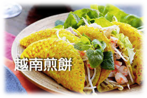 煎饼时所发出的滋滋声,主要成份为粘米粉、水、姜黄粉,南越一带流行加入椰浆,常见馅料为芽菜、猪肉、虾、生菜,常配以薄荷、紫苏等香叶同吃,醮以水蘸汁同吃。在国外,这种煎饼有时会叫成斑戟,但越南煎饼的饼皮不含鸡蛋,其黄色源自姜黄粉。