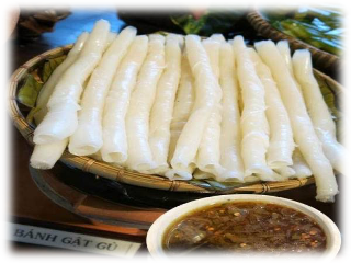 “摇头晃脑”饼,这种饼的外型像肠粉,长长、卷卷的。吃的时候,拿饼蘸上特制酱汁,加上已调制好的一块扣肉。轻咬一口,嫩嫩的肠粉,汁浓,肉香等全部的美味在口中久久不散,边吃边点头赞美。在广宁省的所有地方都能找到这个美味独特的饼。