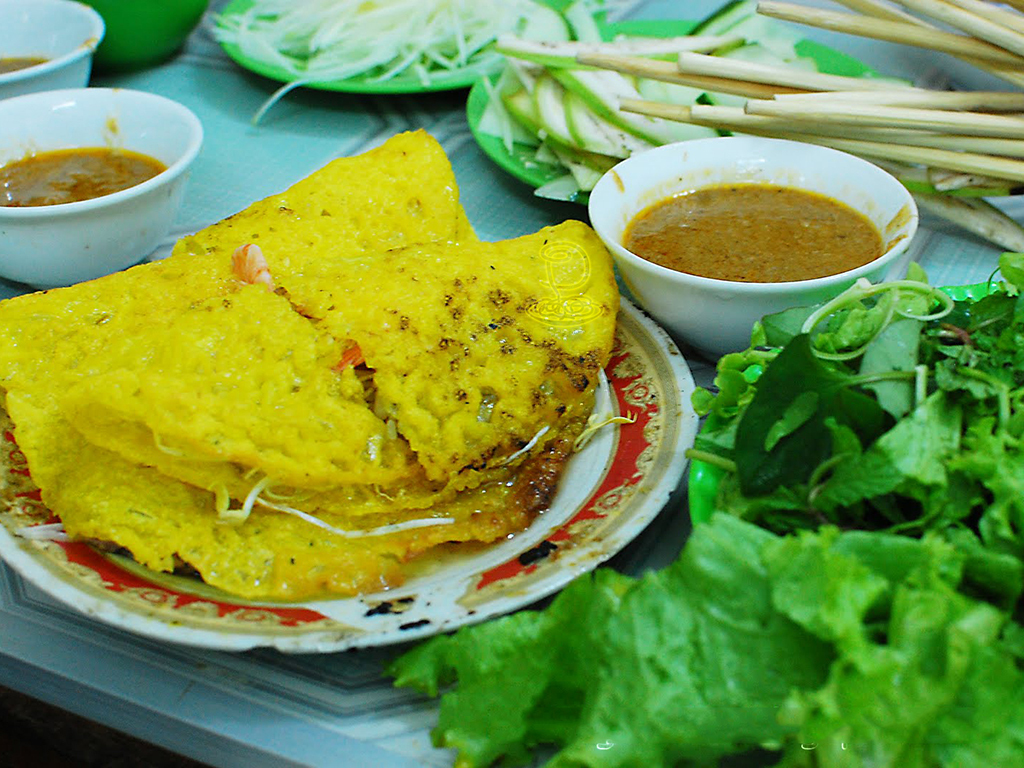 As a folk dish and appeared in many street food lists, banh xeo became familiar with many people. Pancakes are wrapped in a thin layer of rice paper, served with raw vegetables and dotted with sweet and sour fish sauce, eaten in a crispy crust of the crust and greasy bean sprouts of meat and shrimp.