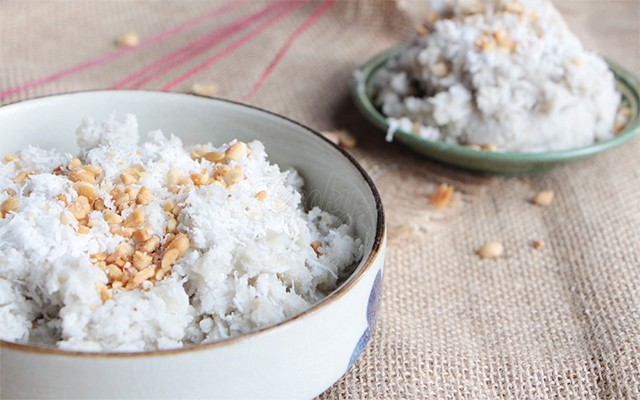 This is one of the most unique food in Tien Giang. Ground banana and coconut are mixed together, then served with fish sauce and raw vegetables. Unripe bananas are soaked in water until it releases all the latex before boiled. Then let it cool, mixed with coconut, adding some sugar and salt until the mixture is dense, then served into a plate. At first, I had some troubles when rolling it with rice paper and raw vegetables. But as I dipped it into fish sauce with ground chili and garlic and tried one bite, I felt a strange savor that I have never tried before.