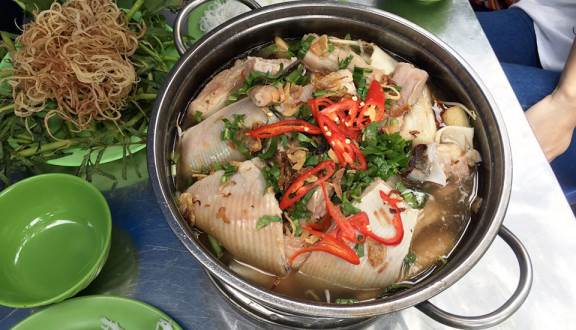 Fish will be chopped into medium pieces, cartilage chopped into small pieces as well, then we stew them with low heat in order to have the sweet broth. After that, add some spices to be well-seasoned: some tamarind juice, sour bamboo shoots, cilantro and coriander finely chopped. The hot pot is often served with fresh bun (a kind of Vietnamese noodle), green banana, flowers of banana tree, and a small bowl of fish sauce with some slices of chili. Sawfish hot pot has its unique taste: sourness and lightness of tamarind and young bamboo shoots, sweetness from pieces of chewy saw fish and crispiness from cartilage. All these taste will absolutely please diners when trying this dish.