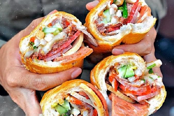 混合法式和越式的独特口味新创出来的在地美食。三明治之中会抹上越南猪肝酱、美乃滋或是在地的鲜味露等,夹上火腿或是肉片,当然还会配上小黄瓜、腌渍木瓜片和各种香菜和蔬菜。最后当然少不了辣椒酱等调味酱。
