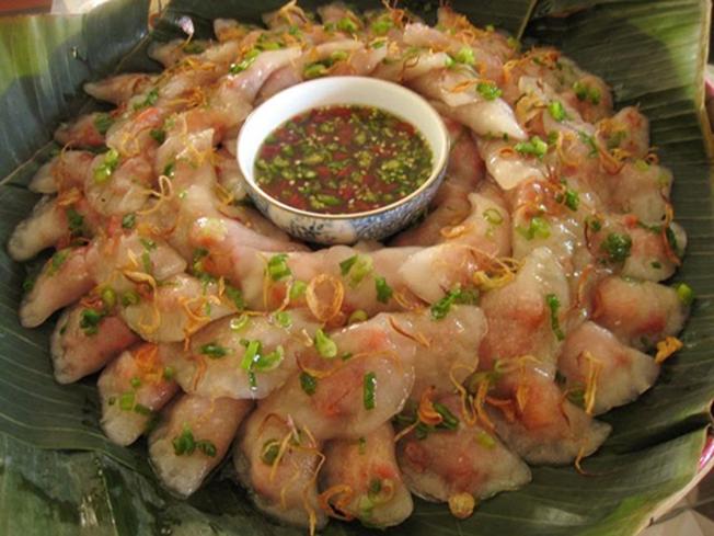 外皮是用米粉做的,里面的馅是虾肉,猪肉炒香, 做成一个个小小白色透明的小糕。沾上一点鱼露,咬一口有点韧劲的外皮后露出香甜的虾肉馅非常美味。