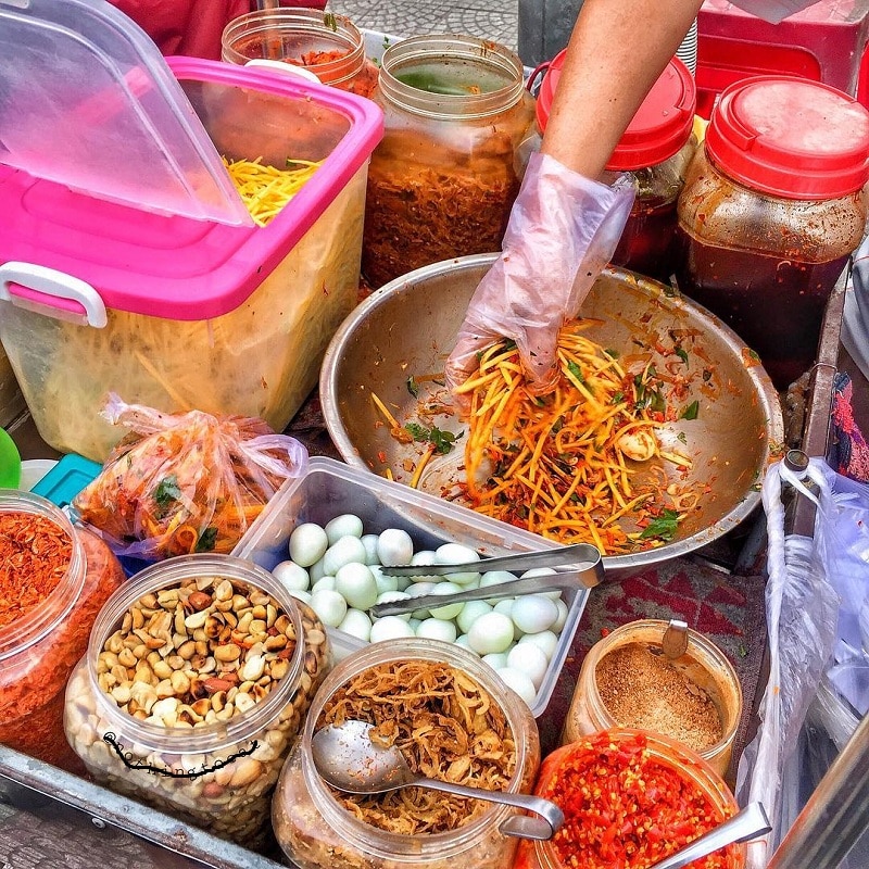 由米纸发展出的料理、零嘴相当多样化,这是越南当地人最喜欢的特色小吃。沙拉内的米纸呈长条状,遇到液体就会黏黏的特性,很好吸收沙拉酱汁,配上蔬菜其实味道相当不错。涂上调味料的米纸,挤上柠檬,咸中带酸,还附上一颗小鸟蛋。一口接一口,味道相当不错。