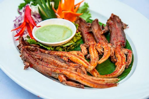 游客不可错过这里的叶鲱凉拌,叶鲱切片去骨后,用冰浸泡,吃的时候加上柠檬让鱼半生熟,加上各种香菜、洋葱、生蕉片、杨桃、蒜蓉辣椒、花生等。可以卷在米纸里吃。叶鲱的香甜加上各种配料的味道,令人赞叹不已。