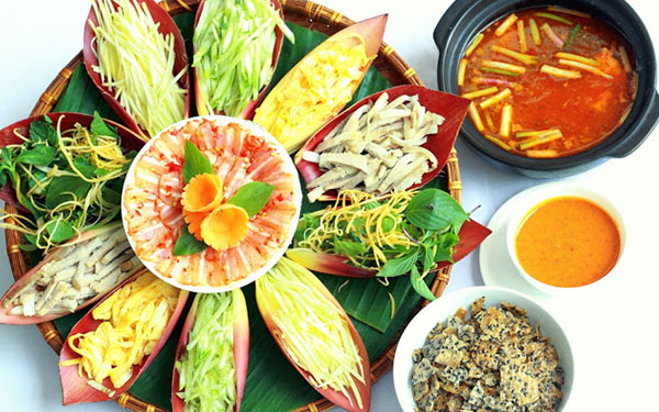 这种火锅只有在美奈能吃得到,主要使用叶鲱,这种鱼在平顺省藩切水域有很多。叶鲱切成片,用沸水烫一下后用柠檬汁洗净,然后用辣椒、蒜泥和老姜汁腌制。在竹托盘上,铺上嫩绿的香蕉叶,将香蕉花摆成花瓣状,在每个花瓣上摆放鸡蛋、黄瓜、香蕉花丝、五花肉、青芒果。花蕊是鲜白色的叶鲱,其上面摆着红色的辣椒。火锅汤是用西红柿、虾丁炒洋葱制,然后加水煮沸。在炉子上的芬芳烟气的土锅被盛来,唤醒食客的味蕾。