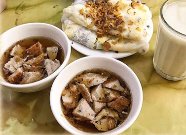 Bánh cuốn là món ăn dân dã của người Hà thành. Nguyên liệu để làm bánh cuốn là loại gạo ngon được xay thành bột, sau đó pha với nước rồi tráng trên bếp thành những miếng bánh mỏng dính. Nhân bánh được làm từ thịt heo, nấm hương, khi bánh được cuộn lại bên trên rắc thêm một ruốc tôm. Món này ăn kèm với nước mắm, cà cuống và chả quế.