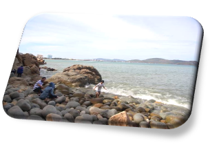 khoảng 20 -30 phút. Ở đây, các bãi tắm là bãi đá cuội tròn (không có bãi cát) được tạo nên từ những vách đá bị bào