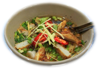 gia vị. Còn sợi bánh làm bằng bột gạo pha với bột mì, khi chín có độ dai và màu trong rất lạ. Nước dùng chủ