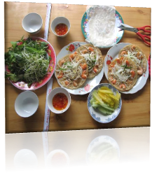 nước cốt dừa. Phần nhân bao gồm tôm đất nhỏ nhưng chắc thịt. Đĩa bánh xèo dọn ra với sắc màu vàng của nghệ,